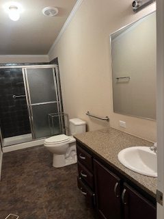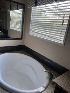 Master bedroom has large garden tub, and separate walk-in shower, double vanities, and opens into large walk-in closet.